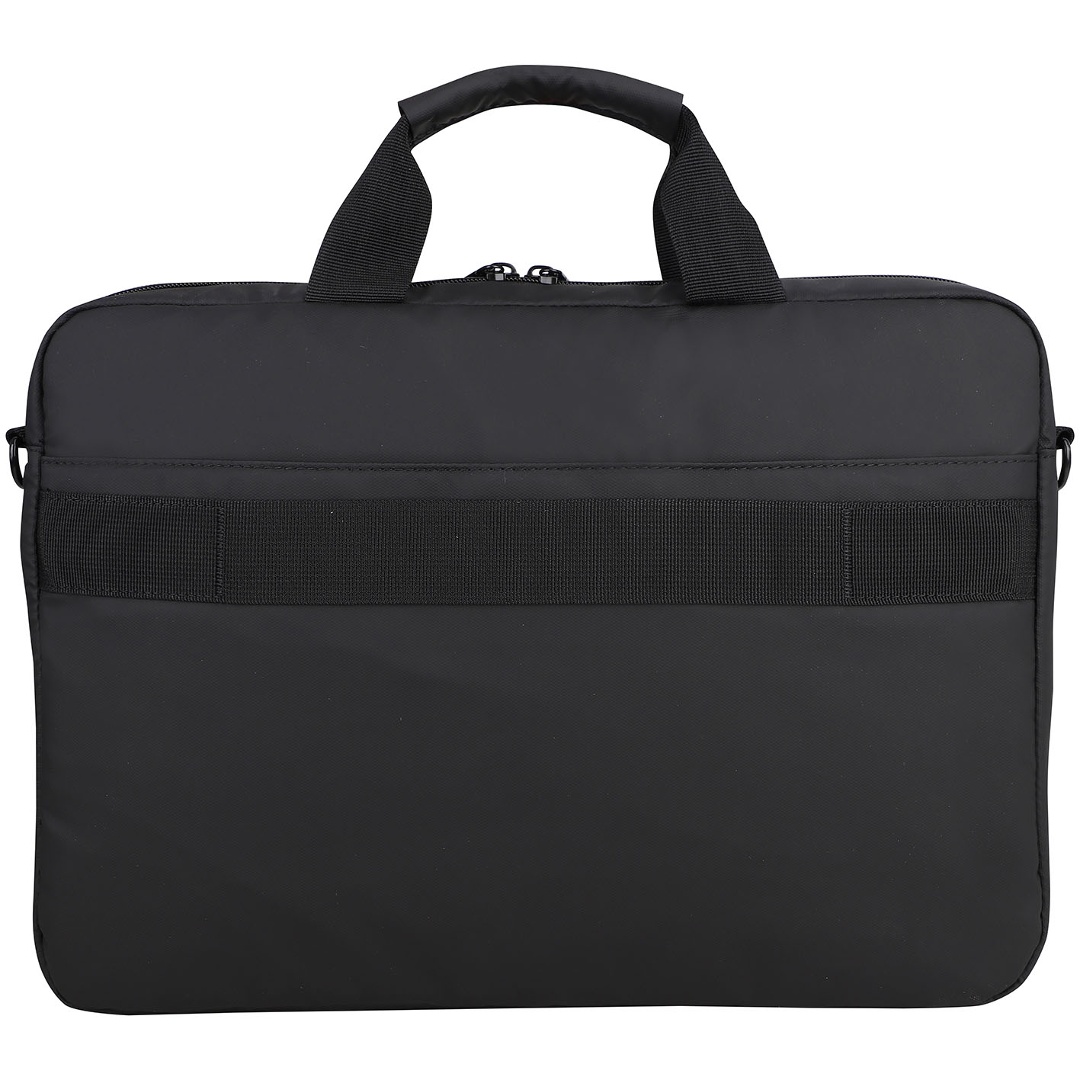 Diseño sofisticado para laptops de hasta 15.6 pulgadasColor negro Costuras decorativas en rojoBolsillos frontales con cierre semi ocultos para pequeños dispositivosBolsillo principal con doble cierreCompartimiento interior acolchonado para laptop con divisiones adicionales para documentosManija superior y correa para hombro incluidaCorrea trasera para enganchar en valija carry-onCapacidad: 6 litros